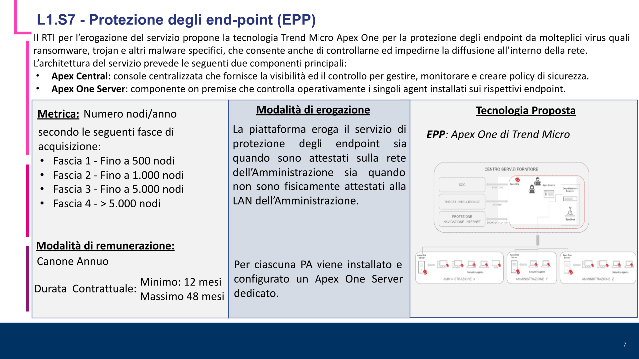 L’AQ Sicurezza da remoto si affianca alle iniziative strategiche relative alla fornitura di beni e servizi di Sicurezza in modalità “on-premise” in attuazione del Piano Triennale per l’informatica nella Pubblica Amministrazione, i cui perimetri di fornitura afferiscono a diverse modalità di gestione della sicurezza IT. L’iniziativa Sicurezza «on premise» si basa infatti sulla fornitura di componenti hardware e software da utilizzare presso le infrastrutture della PA. L’AQ Sicurezza da remoto si basa sull’utilizzo di servizi, che verranno erogati remotamente alle PA mediante il Centro Servizi dell’Aggiudicatario concretizzando il modello strategico di evoluzione digitale che dovrà essere adottato dalle Amministrazioni.